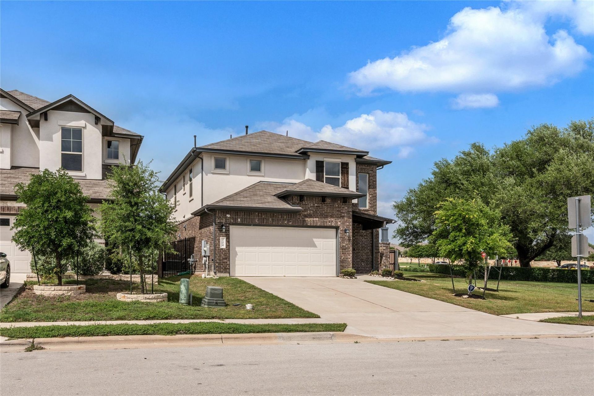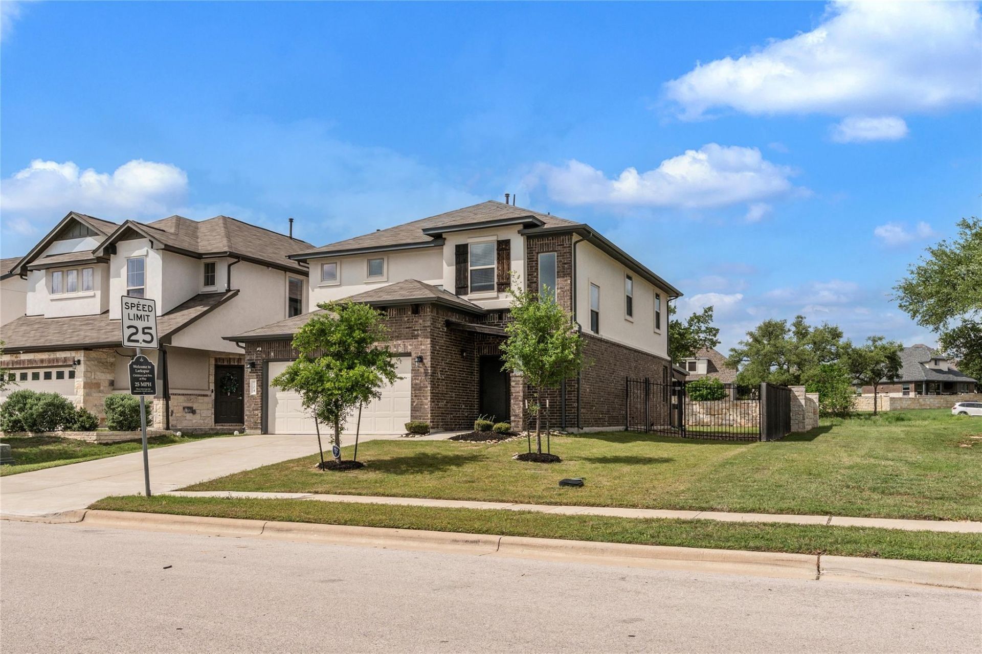 Beautifully upgraded two-story home in the highly desirable Larkspur community, ideally situated on a premium corner lot directly across from the amenity center, offering walkable access to the pool, fitness center, park, and event space. With only one neighboring home and greenbelt behind, this property provides a rare combination of privacy, tranquility, and convenience. Located just minutes from new retail developments including Costco and Target, everyday shopping and dining are easily accessible.Inside, the light-filled open-concept layout features laminate hardwood flooring, soaring ceilings, and a spacious living room with modern industrial lighting and retractable ceiling fan blades. The dining area comfortably accommodates an 8-person table, while the upgraded kitchen showcases a large center island with breakfast bar, pendant lighting, Whirlpool 5-burner gas range, stainless steel appliances, quiet dishwasher, oversized stained cabinetry, and elegant 2-inch bullnose granite countertops. Fresh interior paint and a neutral palette make the home truly move-in ready. A convenient half bath completes the main level.Upstairs offers four generously sized bedrooms, all with ceiling fans, along with a utility closet. The spacious primary suite features a large walk-in closet and a well-appointed bath with double vanities and walk-in shower. The fully insulated garage adds flexibility for storage, hobbies, or climate-sensitive use.The private backyard is an entertainers dream with a fully equipped outdoor kitchen including sink, refrigerator, storage, Blackstone grill with stone surround and granite counters, plus a nearly new oversized 8-person spa. A 12x28 extended covered patio with two ceiling fans and TV mount completes the outdoor living space. Zoned to highly rated schools with easy access to Hwy 183 and Austin.