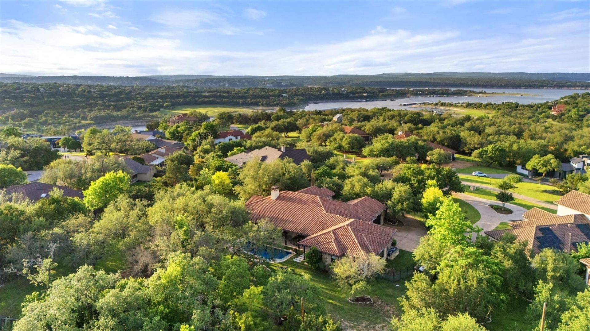This exceptional property offers a sense of peace & space that is increasingly hard to find. Located within an intimate gated enclave of just seven additional homes (each on 1+ acres with separation from neighbors), the setting feels private, quiet & expansive with minimal traffic. Just steps from Hurst Harbor Marina, with boat slips available offering effortless access to Lake Travis living while remaining high & dry outside the floodplain.Designed in a Santa Barbara meets Texas Hill Country style, this single-story home blends timeless architecture with everyday comfort. The open floor plan is inviting & functional with seamless transitions between indoor & outdoor living, enhanced by multiple rooms with direct access to the outdoors. Natural light pours through expansive windows, framing serene views & creating a warm, welcoming atmosphere.The home features 4 bedrooms with an ensuite bath & a pool bath with direct outdoor access. The owners wing includes a private suite & study, while the open main living area flows effortlessly to the outdoor living space overlooking the pool & peaceful backyard. An entertainment hall with snack bar just outside the den adds yet another layer of functionality, with thoughtful extras throughout that make the home ideal for entertaining. The kitchen & entertaining spaces are beautifully appointed with built-ins, a butlers pantry, wine closet, ice maker & beverage refrigerator, designed for both ease & enjoyment. There is an abundance of storage & custom crown molding.Outside, a stunning pool with waterfall anchors the backyard, surrounded by mature landscaping, blooming roses, visiting birds, & soft string lights that create a magical setting for evenings. There is ample space to garden, expand, or simply enjoy the natural beauty. Minutes from Lakeway amenities, including HEB, dining, shopping & Lake Travis ISD schools.Properties offering this combination of land, location & lifestyle are rare.