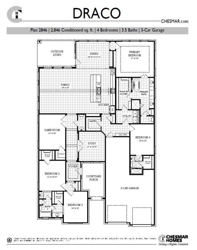 New Construction | 1-Story | 2,846 Sq Ft | 4 Beds | 3.5 Baths | Game Room | Study | 3-Car Tandem Garage | Available Summer 2026 | The Draco offers a spacious and thoughtfully designed single-story layout with six total interior spaces, including four bedrooms, a dedicated study, and a game room, providing flexibility for a variety of lifestyles. Available before Summer 2026. A covered courtyard front porch leads into a tray ceiling foyer, where two secondary bedrooms with walk-in closets share a full bathroom with separate vanities. Further into the home, a game room with French doors sits on one side, while a private study with French doors and a nearby powder room offer additional functional space. The layout then opens into a vaulted family room with a tile fireplace, filled with natural light and connected to the kitchen and dining area. The kitchen features a single island, built-in stainless steel appliances with a gas range, a walk-in pantry, and easy access to the hall tree, utility room, and garage. The dining area provides access to the covered outdoor living patio and leads into the tray ceiling primary bedroom. The primary suite includes French doors to the ensuite bath with separate vanities, a free-standing soaking tub, a walk-in shower, and a spacious walk-in closet with direct access to the utility room, creating a convenient loop for effortless laundry days. An additional secondary bedroom with its own ensuite bath and walk-in closet is located near the utility area, offering a private and flexible setup. With high ceilings, natural light, luxury vinyl plank flooring in common areas, and designer tile in bathrooms, this home blends comfort and functionality throughout. Visit our model and ask about current buyer incentives!