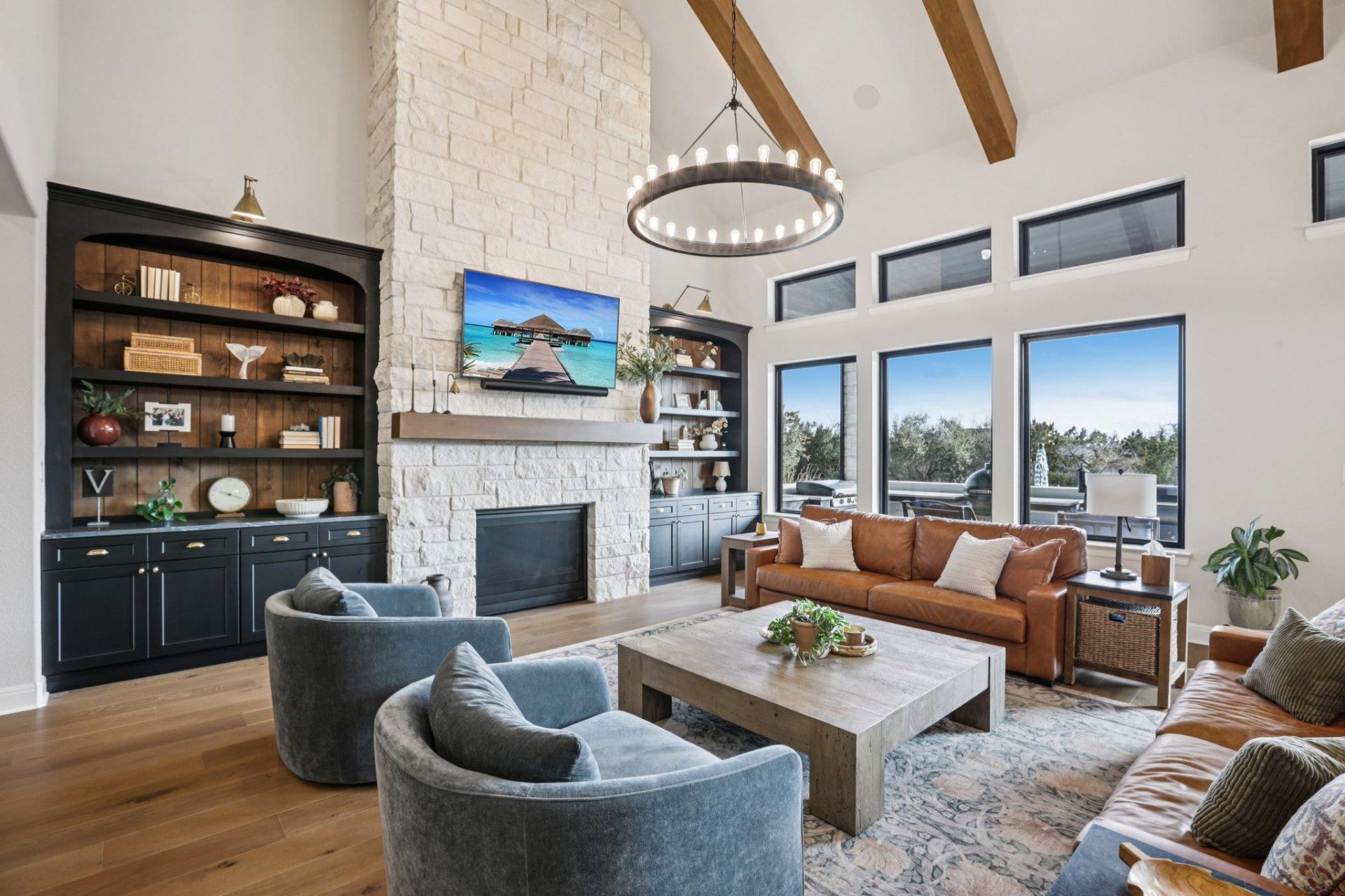Setting a new benchmark for Northshore luxury, this pristine 2024 estate combines high-performance living with the ultimate private resort experience on a one-acre lot. Spanning an impressive 5,237 square feet, the residence is brilliantly configured for both grand-scale entertaining and multi-generational privacy, featuring an attached in-law suite and a detached pool casita with its own living space, kitchenette and full bath. The interior is a study in refined craftsmanship, where soaring wood-beamed ceilings and a limestone fireplace anchor the open living space. A true culinary centerpiece, the gourmet kitchen dazzles with quartz surfaces, professional-grade appliances, and a hidden prep pantry equipped with a built-in wet bar. The home is fully equipped with a SONOS surround sound system, ensuring the perfect ambiance travels from the indoors to the expansive outdoor terraces. The primary suite is designed as a personal retreat, highlighting a tray ceiling, spa-inspired bath, and a dedicated workout room that intelligently connects to the laundry center. The second level significantly expands the living potential, featuring a spacious flex game room and a custom theatre styled with an authentic exposed brick wall and reclined seating. Two additional secondary bedrooms on this floor feature private en-suite baths, ensuring total comfort for family and guests. Outside, the backyard rivals high-end vacation destinations. The custom heated pool is an architectural gem featuring a swim-up bar with built in stools and a tanning shelf ideal for relaxing and enjoying the sun. A fully equipped outdoor kitchen, stone fireplace, and peekaboo lake views complete this extraordinary outdoor setting. Residents of The Hollows enjoy exclusive access to the Beach Club, over 10 miles of trails, and the deep-water Northshore Marina. Experience this resort lifestyle firsthand?schedule your private tour today.