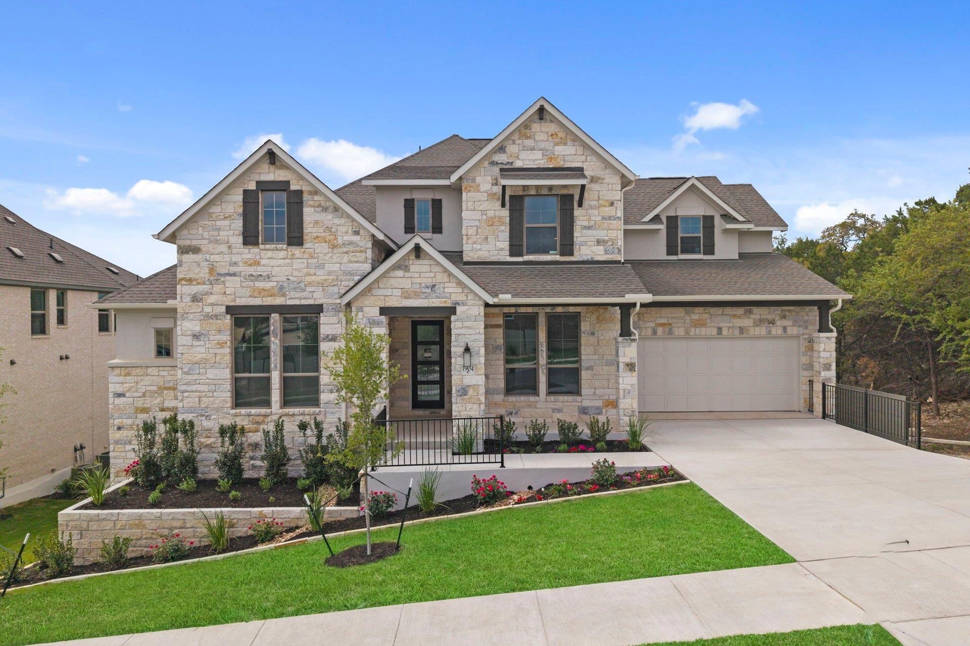 New Coventry Home! Experience the superior design and functionality of our most popular Weston floor plan. Enjoy excellent curb appeal with this home's beautiful gray stone and stucco elevation with a covered porch. The grand foyer greets you with a 20' ceiling and dramatic curving staircase, opening to the great room with a gas-log fireplace surrounded by stunning floor-to-ceiling tile. Wood floors extend throughout the main living areas, plus the study, game room and primary bedroom. The kitchen features two-tone white shaker cabinets with trash pull-out, pot and pan drawers, designer tile backsplash, stovepipe vent hood, single bowl sink, and desirable quartz counters. The large covered patio and roomy yard are perfect for entertaining. Retreat to the luxury primary suite with split sink vanities, a garden tub, and a tiled walk-in shower with a seat. A secondary bed and bath are also conveniently located on the first floor. Upstairs, you will find a second game room and three additional bedrooms. Located in the much-desired Wolf Ranch, enjoy two amenity centers with multiple pools, sports courts, nature trails, parks, and more! ** Ask us about our low interest rates & special financing! Visit Onsite for details ? subject to change without notice. **