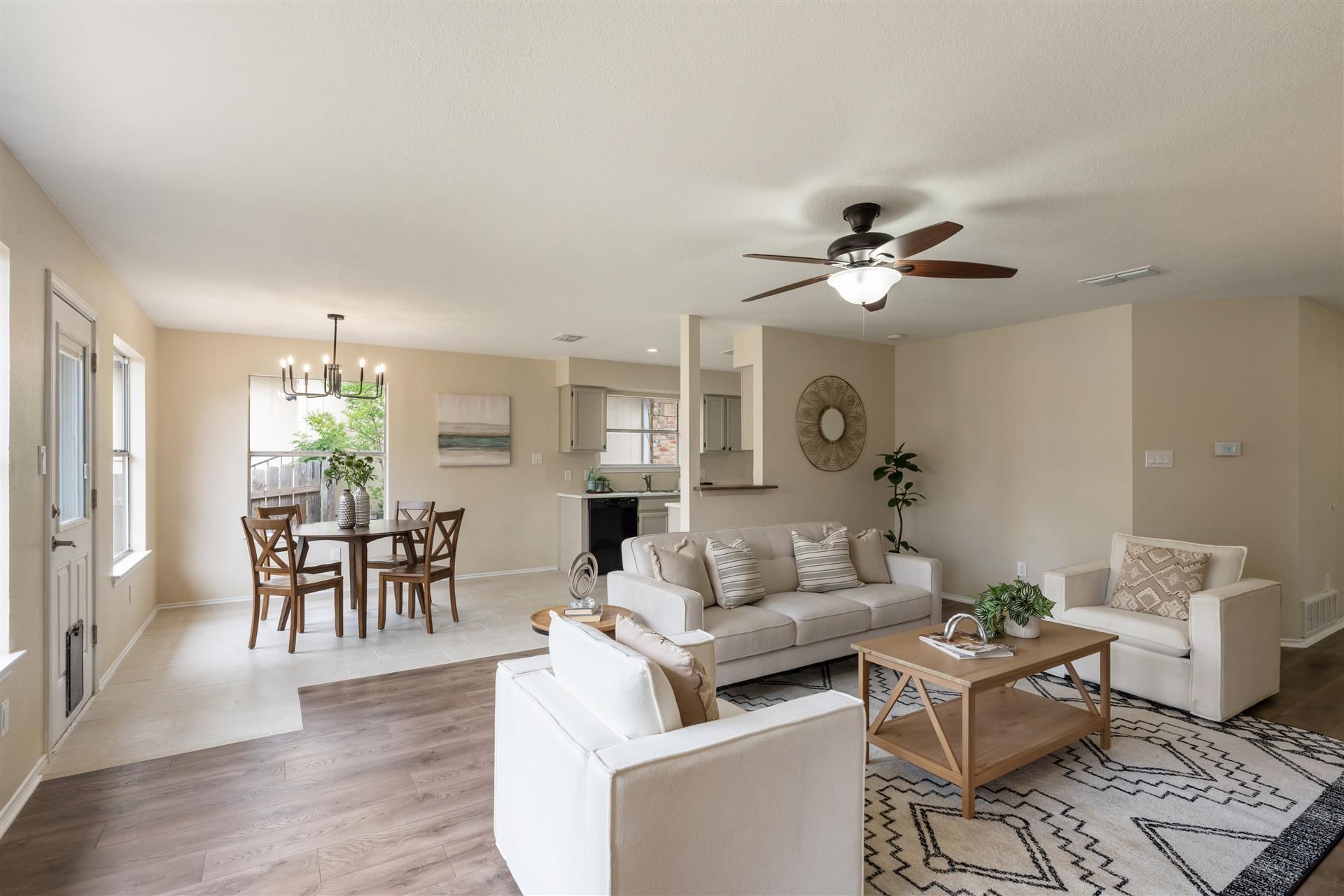Beautifully updated and move-in ready, this home features recently installed flooring, fresh interior and exterior paint, and upgraded lighting, hardware, mirrors, and kitchen countertops. The spacious, open-concept floor plan is filled with natural light, highlighted by a stately fireplace and an abundance of windows. The kitchen showcases designer-painted cabinetry, creating a stylish and inviting space for everyday living and entertaining.Enjoy the convenience of being just steps from the community pool, parks, and scenic hike and bike trails. Major updates include a new roof (2025) and HVAC system (2021), along with a $10,000 comprehensive duct system upgrade completed in 2025, offering added efficiency and peace of mind.