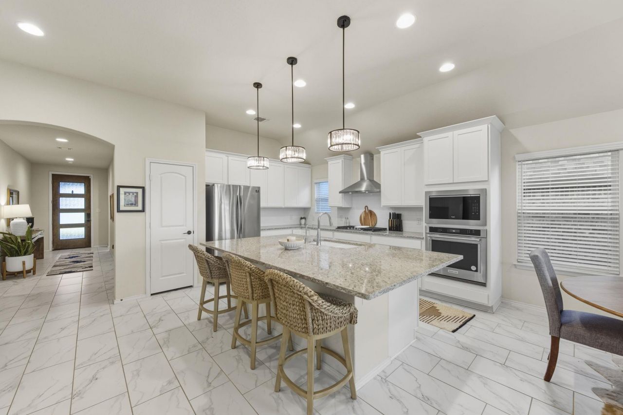Welcome to this beautifully maintained 4 bedroom, 2 bath Pulte home in the highly sought-after Veramendi community. Built in 2023, this spacious one-story offers 2,129 sq ft of comfortable, open-concept living with thoughtful design throughout. One of the standout features of this property is its rare homesite, backing to private land with no current rear neighbors, providing an exceptional sense of privacy and peaceful Hill Country views. The heart of the home is the bright and inviting kitchen, featuring a large island, gas cooking, stainless steel appliances, and plenty of cabinet and counter space. The kitchen opens seamlessly into the dining area and living room, where abundant natural light and a cozy fireplace create the perfect setting for everyday living and gathering. The private primary suite is generous in size, offering space for a seating area and a bay window that frames scenic views. The ensuite bath includes a soaking tub, separate shower, and double vanity. The home also features four dedicated coat, storage, and utility closets that provide exceptional organization and convenience throughout the layout. Three secondary bedrooms offer flexibility for guests, office space, or hobbies. Additional highlights include tile flooring in main areas, carpet in bedrooms, a water softener, and a covered back patio overlooking the fully fenced yard. Located in Veramendi, residents enjoy access to community amenities including a pool, multiple parks, playgrounds, and walking trails, all within minutes of schools, shopping, and dining in New Braunfels. This home combines modern comfort, thoughtful design, and a rare private setting. Do not miss the opportunity to make it yours.